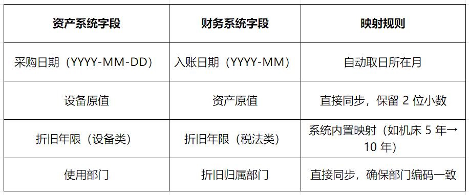 例子:有家电子厂梳理后决定,先同步固定资产建档、折旧、报废的数据,同步频率是 “资产变动实时更、折旧每天更 1 次”。